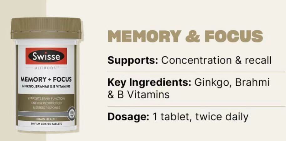 Ultiboost Memory + Focus is a premium, vegan-friendly formula containing Ginkgo biloba, Brahmi, and B vitamins to support brain function, cognitive performance, memory recall, and stress management. It improves brain blood flow and supports energy levels with a, typical adult dose of one tablet twice daily.