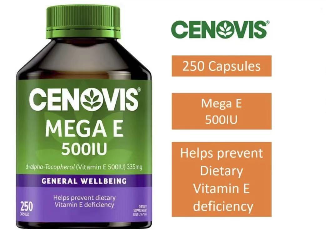 Cenovis Mega E 500IU is a high-strength, naturally derived Vitamin E supplement (335.4mg -alpha-Tocopherol per capsule) designed to support immune system function, particularly in the elderly, while providing antioxidant protection against free radicals. It is commonly used for general wellbeing and maintaining health, with a recommended dosage of one capsule daily